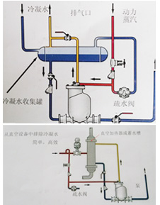 通常冷凝水可以通過(guò)疏水閥很方便地排出設(shè)備,進(jìn)入冷凝水排放系統(tǒng),如果冷凝水已經(jīng)被污染,則應(yīng)該直接排放掉;如果沒(méi)有污染,可以將其回收到鍋爐給水箱以利用冷凝水含有的熱量,這樣同時(shí)也節(jié)省了水和水處理的費(fèi)用。有時(shí)用汽設(shè)備內(nèi)部會(huì)產(chǎn)生真空,這樣會(huì)影響冷凝水的排出,從而影響蒸汽換熱效率,這時(shí)冷凝水就需要用泵壓出去。